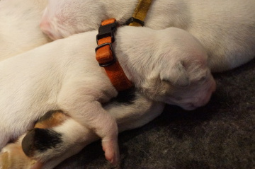 Jetzt sind die Zwerge schon einen Tag alt. Alle trinken gut und halten Mama Lotte auf Trab. Denn die hat jetzt allerhand zu tun: neun kleine Welpen sauber machen, ablecken und mit Milch versorgen ist schon ein Fulltime Job! Da darf man sich auch von Herrchen und Frauchen verwöhnen lassen und sich Futter und Wasser in die Wurfkiste reichen lassen...