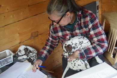 Mittwoch war der letzte große Auftritt für die Punktekinder: die Wurfabnahme!. Unser Zuchtwart Karin Bednorz kam gegen Mittag, um alle Welpen genau zu begutachten. Die Gewichte ( Geburtsgewicht und Gewicht bei Wurfabnahme) wurden von jedem Welpen aufgeschrieben, die Augenfarbe wurde vermerkt und ebenfalls die Tüpfellung. Karin war mit dem gesamten Wurf sehr zuzfrieden. Hurra, ein fehlerfreier Wurf!!!!!