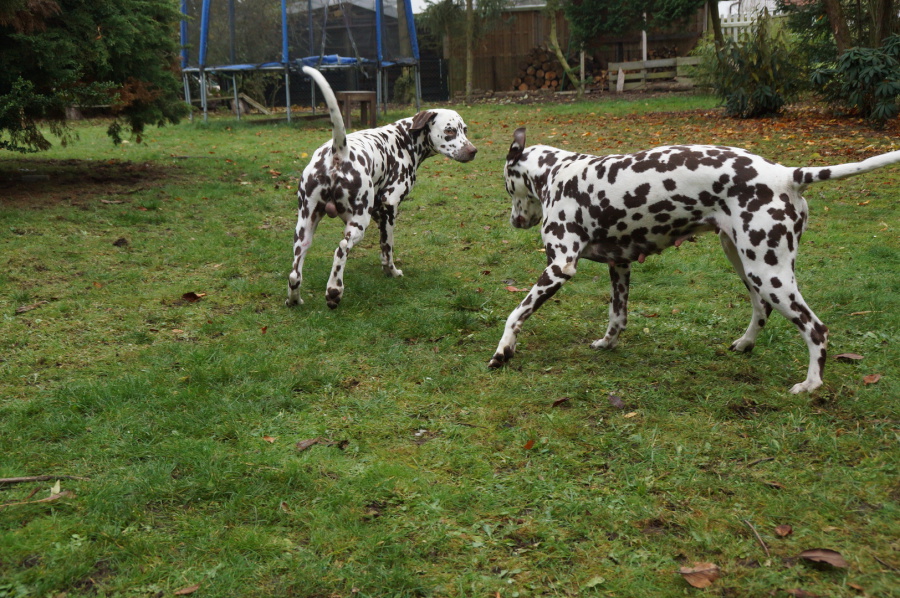 Queenie und Magic Moon waren sich auf Anhieb sympatisch. Zuerst tobten die zwei ausgelassen durch den Garten, um dann nach kurzer Zeit Hundehochzeit zu feiern. Auch die zweite Begegnung am Montag verlief ebenso harmonisch. Jetzt heisst es Däumchen drücken und hoffen, dasss die Begegnung der Beiden fruchtbar war.