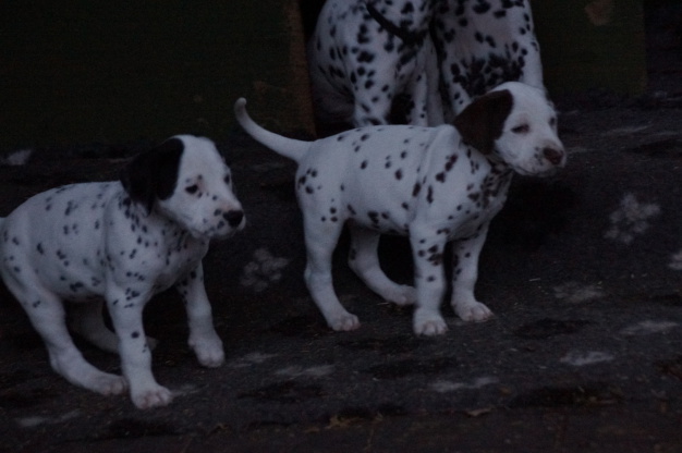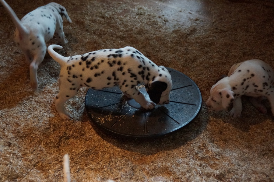 Wir sind in der 6. Woche. Innerhalb der letzten Woche haben alle Welpen gut 1 Kilo zugenommen. Da der Welpenraum doch allmählich zu klein wurde, durften die Punktekinder am Dienstag das erste Mal ins Welpenhaus mit Auslauf. Sie fanden es alle sehr spannend und aufregend ; soviel Spielzeug und so viel Neues zu entdecken.